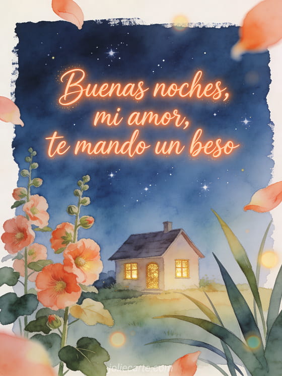 Envía un mensaje amoroso de buenas noches con caligrafía coral, una casita con ventanas doradas, un cielo estrellado y flores de malvarrosa. Descubre también una tarjeta para decir buenas noches, una tarjeta virtual animada buenas noches o una tarjeta animada de buenas noches.