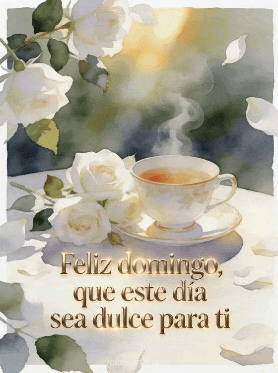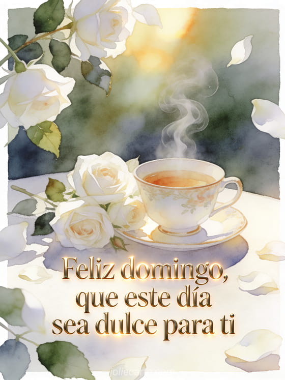 Ofrece un mensaje suave de feliz domingo con una delicada taza de té, rosas blancas y luz cálida en acuarela. Descubre también feliz domingo imagen gratis, feliz domingo sol gif o feliz domingo con café imagen.