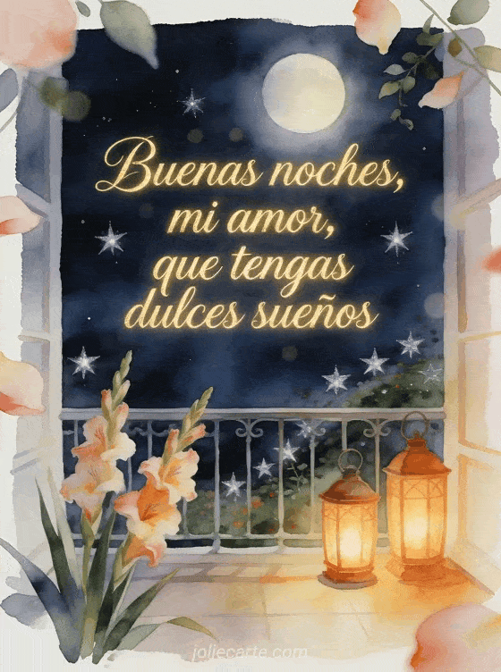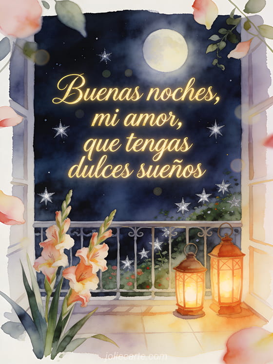 Envía un mensaje romántico de buenas noches con un jardín de balcón bajo la luna, estrellas plateadas, linternas cálidas y gladiolos en luz suave de acuarela. Descubre también un mensaje para desear buenas noches a su novia, una tarjeta de buenas noches gratis o un bonito mensaje buenas noches.
