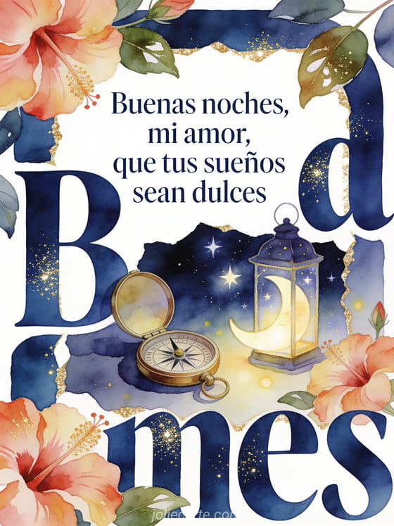 Desea buenas noches con una brújula vintage, una pequeña linterna de luna creciente, estrellas brillantes y pétalos de hibisco en una calma luz nocturna de acuarela. También pueden enviar el mensaje de buenas noches más bonito, una tarjeta virtual de buenas noches gratis o una buenas noches besos tarjeta.