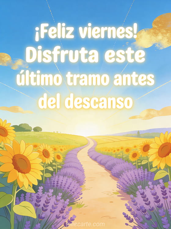 Desea un feliz viernes con un camino de campo primaveral bordeado de girasoles y lavanda, rumbo a un horizonte luminoso y optimista. Descubran también feliz viernes muchos besos, buenos días viernes humor o una bonita tarjeta feliz viernes.