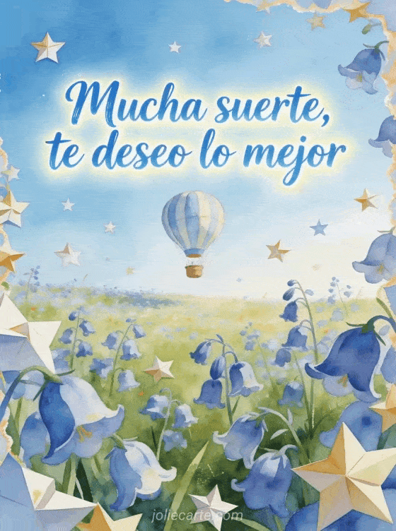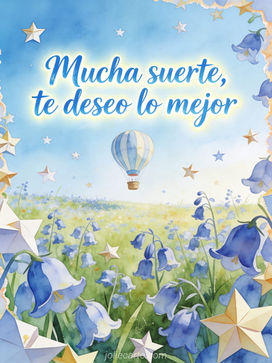 Comparte mucha suerte, te deseo lo mejor con letras azul cielo, un globo aerostático elevándose sobre una pradera luminosa, campánulas y estrellas de papel flotantes. Descubre también buena suerte para los exámenes imagen, buena suerte para lo que viene imagen o buena suerte gato imagen.