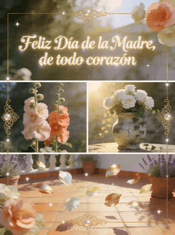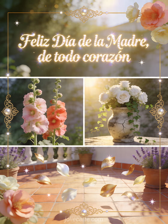Comparte una tarjeta cuidada del Día de la Madre con escritura luminosa, malvarrosas altas, un jarrón de piedra al sol, una terraza clara y pétalos brillantes. Descubre también mensajes para el Día de la Madre, una tarjeta feliz Día de la Madre súper mamá o una carta para el Día de la Madre.