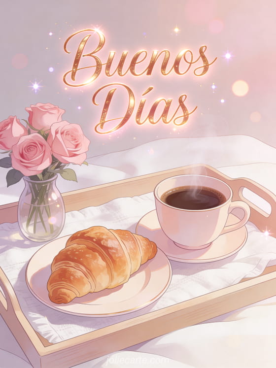 Una cálida y tierna tarjeta de buenos días con una taza de café humeante junto a un croissant fresco en una acogedora bandeja de desayuno con un pequeño ramo de rosas. Descubre también un buenos días mensaje, un sms buenos días para enamorar o una buenos días tarjeta.