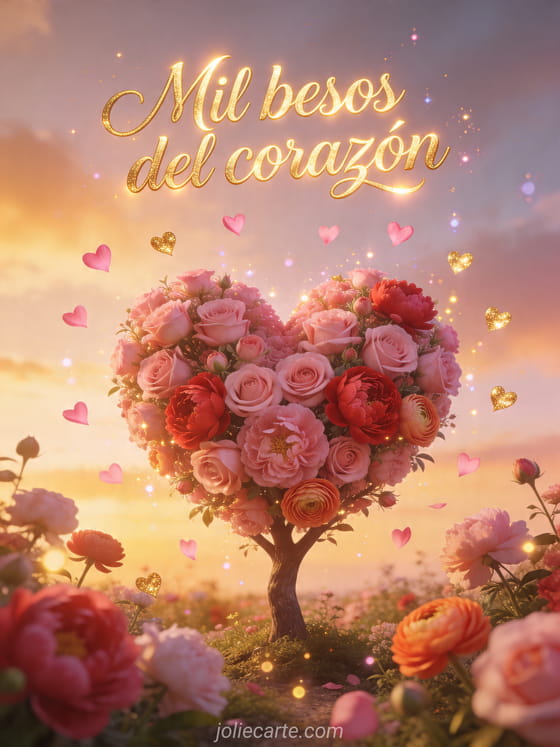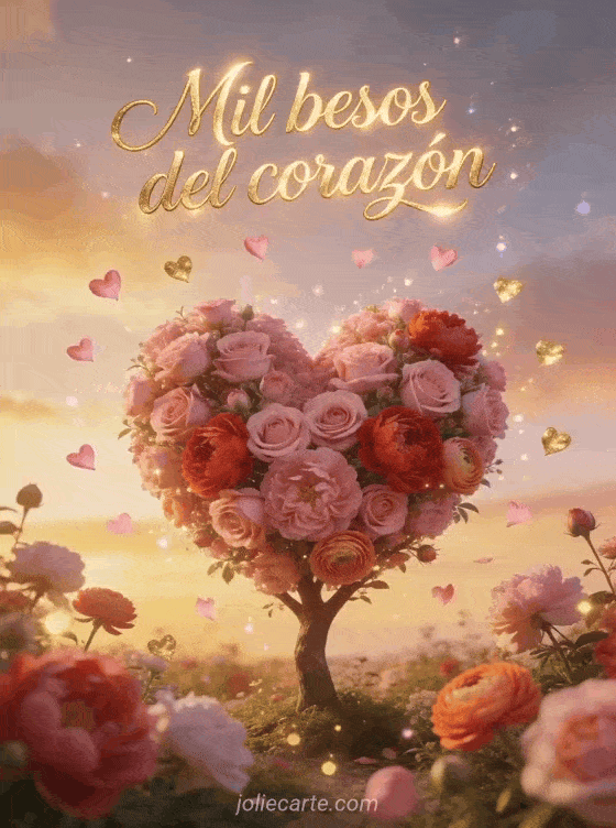 Compartan un mensaje poético con esta tarjeta gratis de besos del corazón con un árbol de flores en forma de corazón al atardecer. Descubran también romántico besos buenas noches gif, besos de pareja en el agua o imagen besos tiernos.