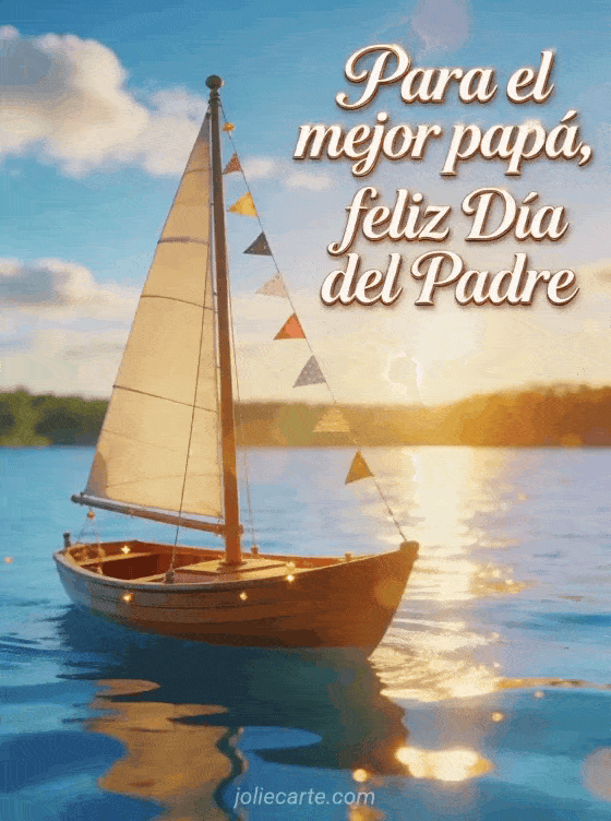Usen un modelo de tarjeta para el Día del Padre con elegante letra blanca, un pequeño velero de madera deslizándose sobre un lago azul tranquilo al amanecer, reflejos dorados y pequeños banderines festivos. También pueden descubrir una imagen del Día del Padre, un poema del Día del Padre o una poesía feliz Día del Padre papá bondad y ternura.
