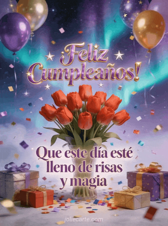 Celebra un cumpleaños lleno de magia con esta encantadora tarjeta de fantasía con vibrantes tulipanes rojos rodeados de confeti colorido, regalos, globos y coloridas auroras boreales danzando en el cielo. Descubre también una tarjeta de cumpleaños para niños o una tarjeta de cumpleaños para niña.