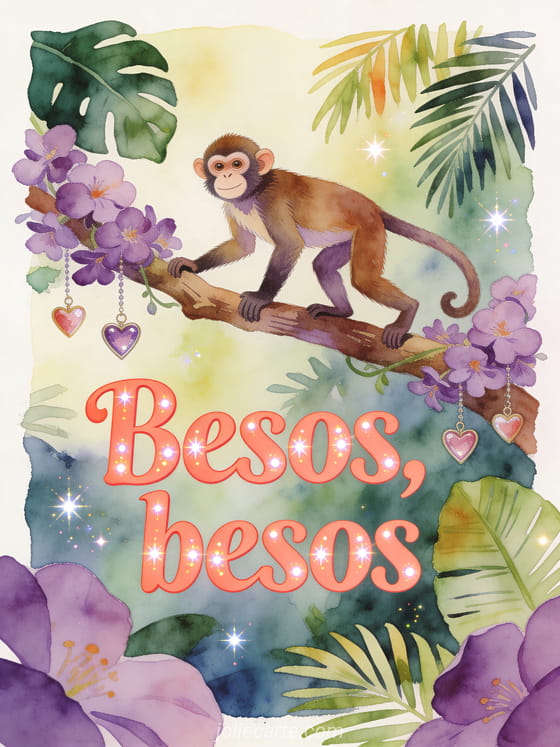 Envía un saludo divertido de besos con letras coral, una rama de jungla, un mono, flores violetas, dijes colgantes de corazón y hojas tropicales. Descubre también envío de besos imagen, un marmota besos gif o una imagen llena de besos.