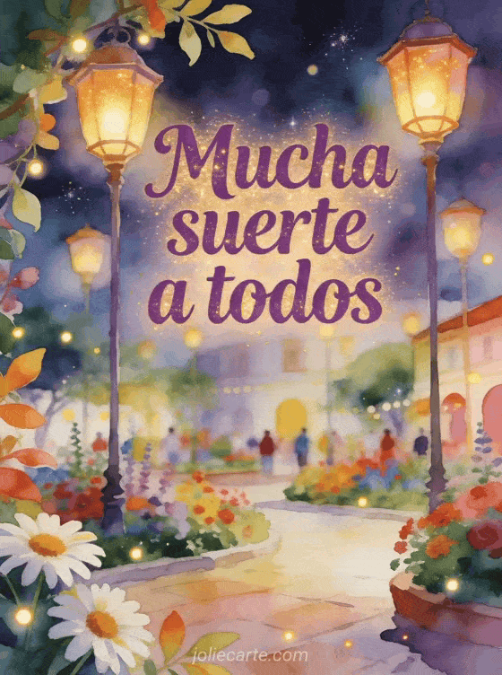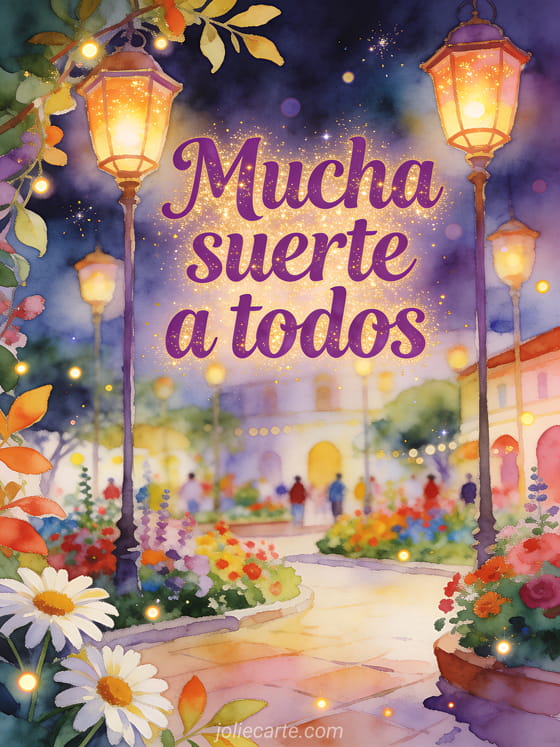 Comparte mucha suerte a todos con letras violetas festivas, linternas luminosas sobre una plaza de jardín colorida, margaritas y hojas brillantes cruzando el borde. Descubre también un mensaje para desearle mucha suerte a alguien, buena suerte para los exámenes imagen o buena suerte para lo que viene imagen.