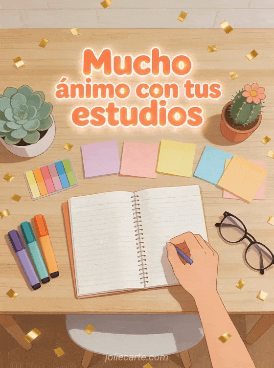Mucho ánimo con tus estudios una tarjeta motivadora con un escritorio colorido y organizado