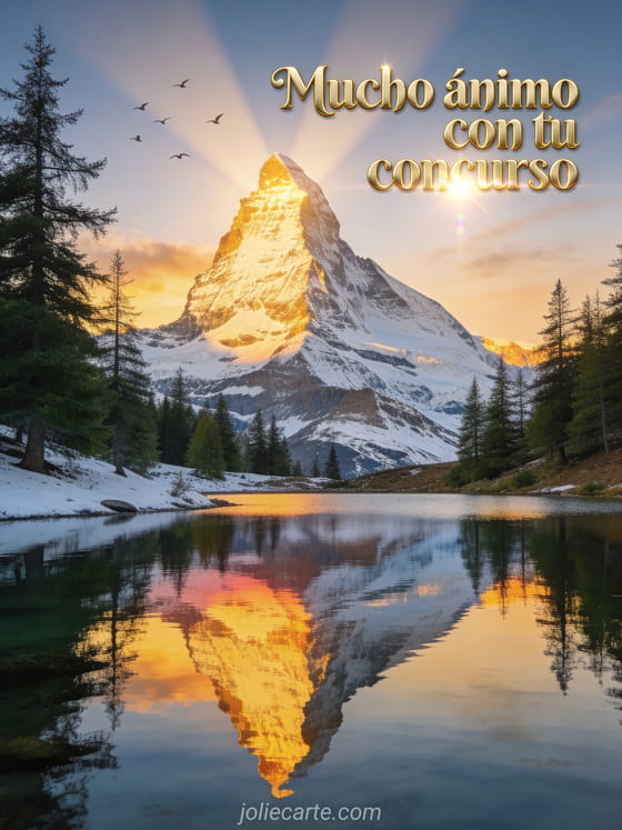 Inspira a alguien antes de su concurso con esta grandiosa tarjeta con una montaña nevada al amanecer, un lago espejo y aves en vuelo. Descubre también una tarjeta ánimo exámenes, una tarjeta ánimo estudios o una tarjeta ánimo examen.