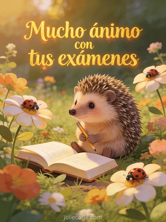 Anima a alguien durante los exámenes con esta adorable tarjeta con un erizo sosteniendo un lápiz junto a un libro abierto en un jardín florido. Descubre también una tarjeta ánimo estudios, una tarjeta ánimo examen o una tarjeta animada ánimo.