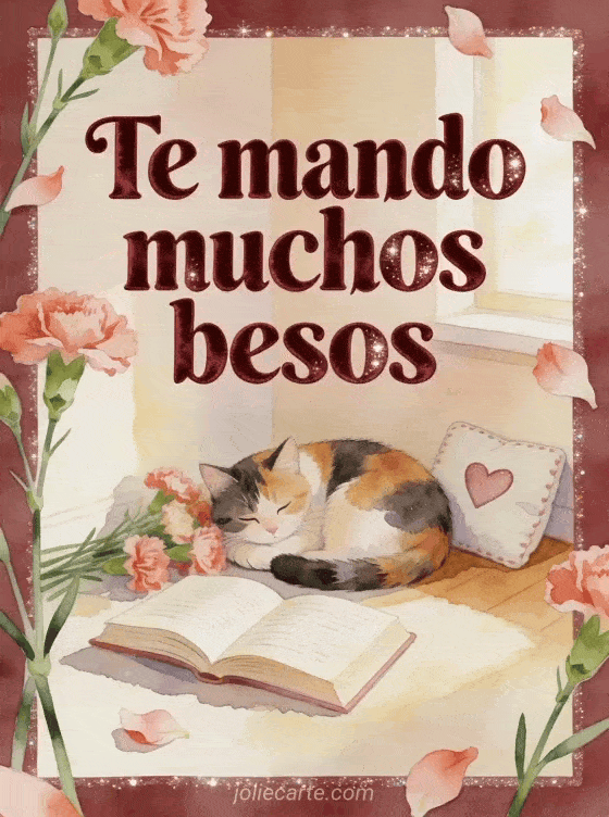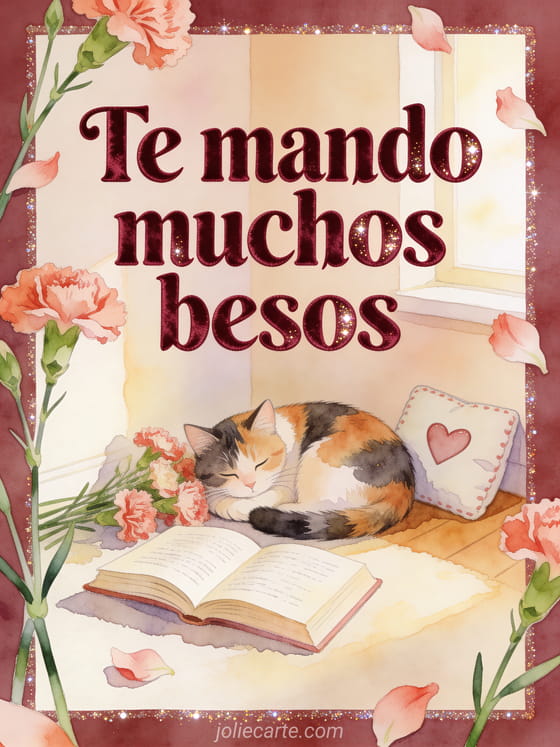 Envía un saludo tierno de muchos besos con una escena acogedora en acuarela, un gato y letras color borgoña. Descubre también una imagen llena de besos, unos besitos o un besos mi corazón gif.