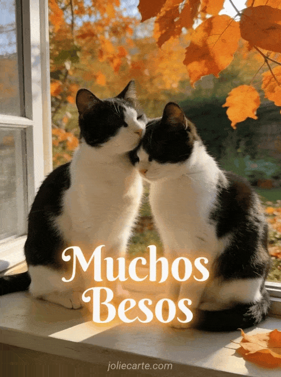 Envía un cálido saludo de muchos besos a alguien especial con esta encantadora tarjeta. Dos adorables gatos en blanco y negro acurrucados en el alféizar de una ventana, bañados por la cálida luz dorada del otoño. Descubre también una tarjeta de abrazos y besos o una tarjeta de muchos besos.