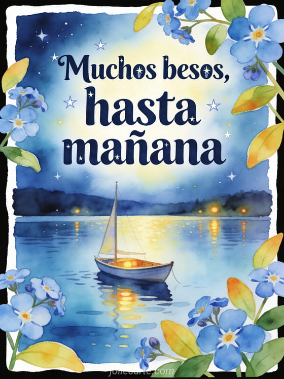 Comparte un deseo azul de noche con letras intensas en acuarela, nomeolvides sobre el borde, un velero pequeƱo en un lago tranquilo, reflejos cƔlidos y un cielo nocturno luminoso. Descubre tambiƩn una tarjeta de hasta maƱana besos gif animado, una tarjeta de besos de la noche hasta maƱana o una tarjeta de muchos besos hasta maƱana.