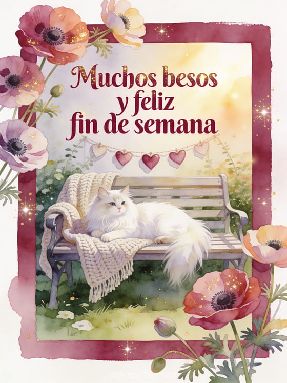 Envía muchos besos y desea feliz fin de semana con un gato angora turco descansando en un banco de jardín, flores de anémona, una manta tejida y una guirnalda de corazones. Descubre también feliz fin de semana muchos besos gif, feliz viernes buen fin de semana besos o imágenes gratis feliz fin de semana besos.
