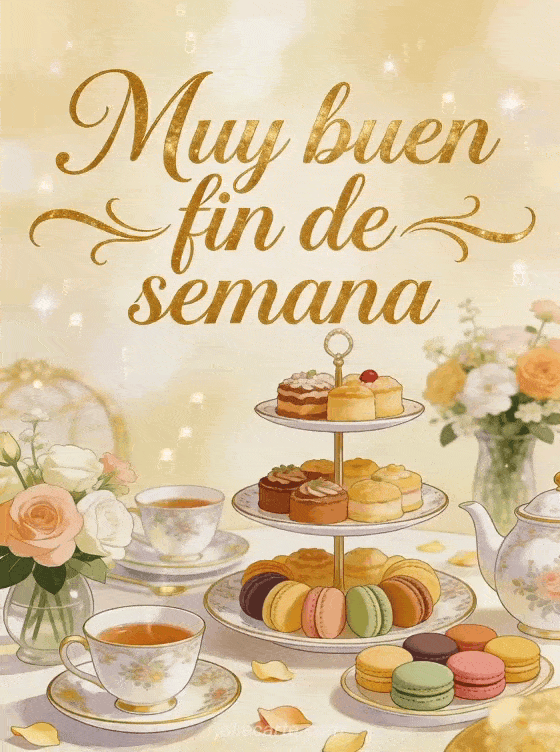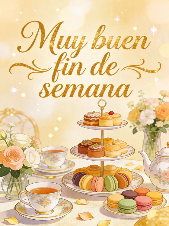 Comparte un saludo refinado de fin de semana con esta tarjeta elegante inspirada en una merienda con té, flores y delicados macarons. También pueden descubrir una buen fin de semana positivo, una imagen buen fin de semana zen o pasar un buen fin de semana.