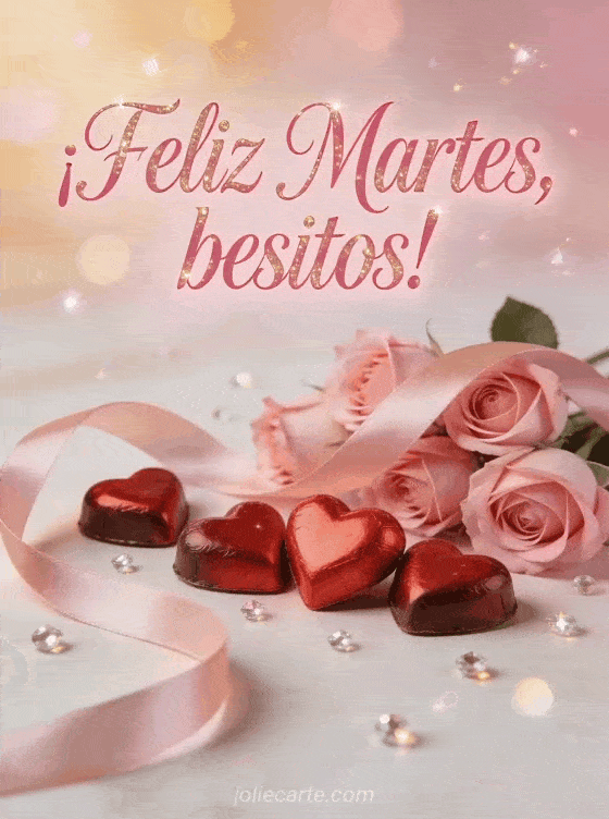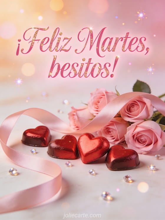 Muy feliz martes besitos una tierna y romántica tarjeta de muy feliz martes con besitos, rosas y chocolates