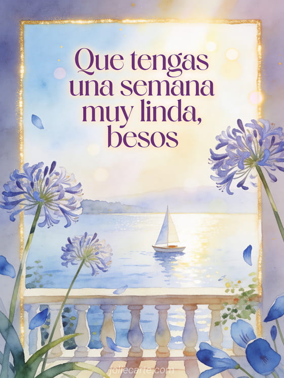 Desea una linda semana con letras violetas refinadas en acuarela, tallos de agapanto, pétalos azules, una terraza serena junto al lago, un pequeño velero, luz radiante de tarde y alegría tranquila. Descubre también una tarjeta de feliz lunes feliz semana besos, una tarjeta de buena semana besos Navidad o una tarjeta de besos y feliz semana.