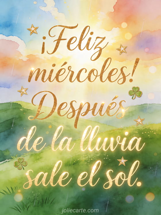 Comparte esta tarjeta gratis de ¡Feliz miércoles! Después de la lluvia sale el sol. y envía un mensaje alegre en segundos. Personalízala en línea y descubre también foto buenas noches de miércoles, imagen buenas noches de miércoles y gif feliz miércoles besos.