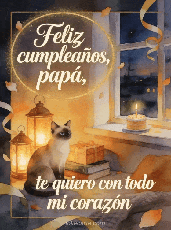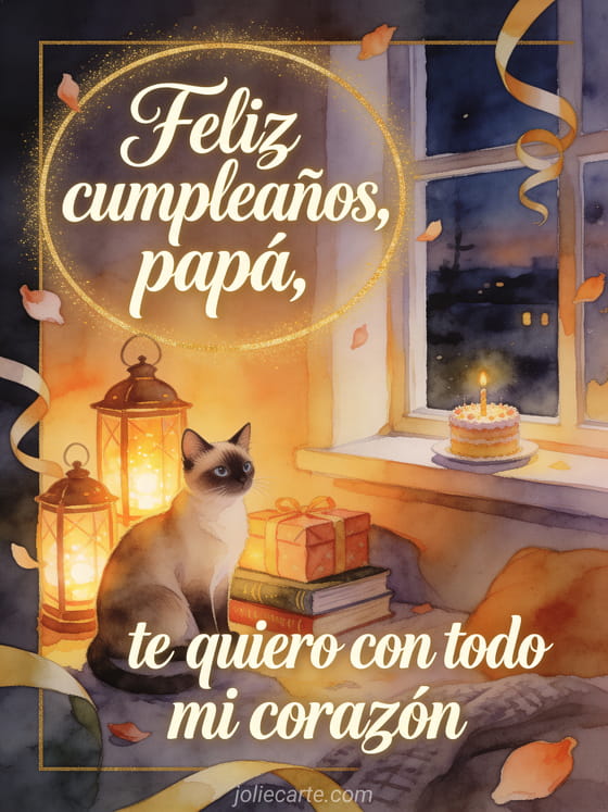 Comparte un texto emotivo de cumpleaños para papá con un gato siamés junto a linternas brillantes, libros envueltos y un pequeño pastel de cumpleaños en un asiento acogedor junto a la ventana. También pueden enviar feliz cumpleaños papá montaje de foto, feliz cumpleaños papá texto o feliz cumpleaños papá simple.