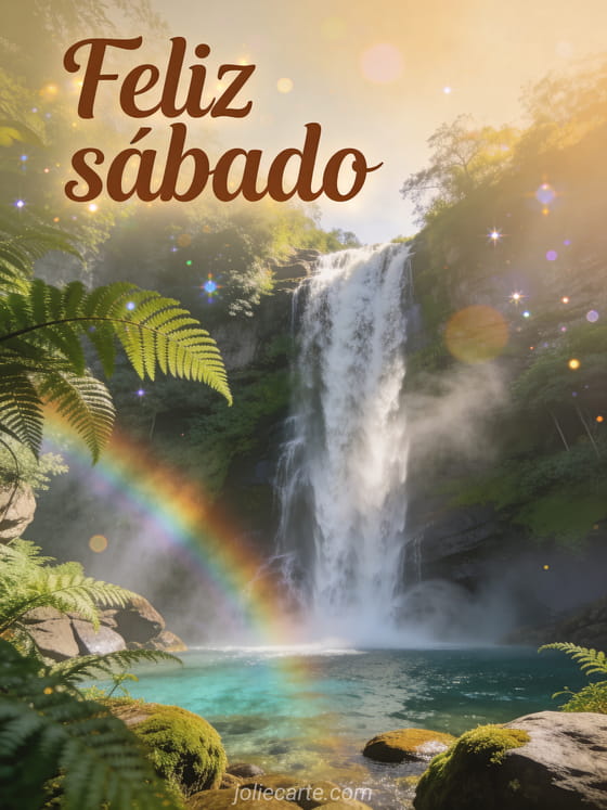 Comparte un saludo tranquilo de feliz sábado con una cascada majestuosa que cae en una poza cristalina, helechos frondosos, rocas cubiertas de musgo y bruma de arcoíris. Descubre también feliz sábado divertido, feliz sábado gifs o buenos días sábado imágenes bonitas.