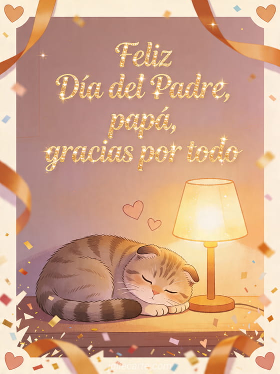 Envía palabras dulces Día del Padre con escritura crema tierna, una ilustración pastel cálida de un gato Scottish Fold acurrucado junto a una lámpara de mesa brillante, corazones pequeños, cintas ámbar y confeti de celebración. Descubre también un gif original del Día del Padre, mi amor mi querido feliz Día del Padre o una tarjeta personalizada Día del Padre.