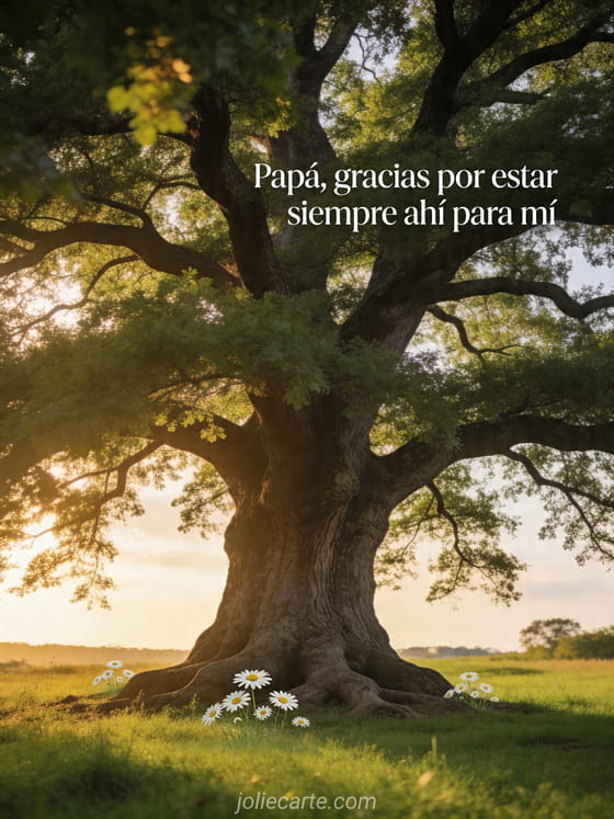 Compartan palabras tiernas del Día del Padre con una imagen serena de un roble centenario en una pradera verde, luz dorada de la tarde y margaritas a sus pies. También pueden descubrir una cita corta del Día del Padre, feliz día del padre papá querido o un feliz Día del Padre papá texto conmovedor.