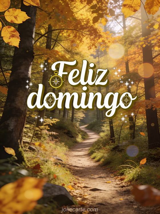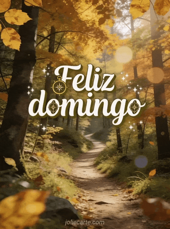 Compartan un saludo fresco de domingo con un sendero en el bosque de otoño, hojas doradas y un ambiente de aventura tranquila. También pueden enviar muy feliz domingo besos o feliz domingo gifs animados gif.