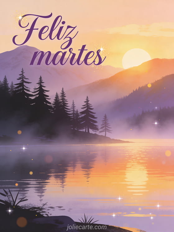 Envía un saludo tranquilo de feliz martes con un amanecer dorado sobre un lago de montaña con bruma y letras moradas elegantes. Descubre también una feliz martes besitos imágenes, un feliz martes buen día gif o una feliz martes imagen gratis.