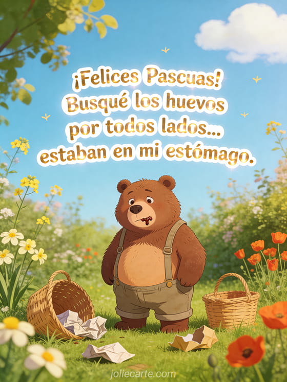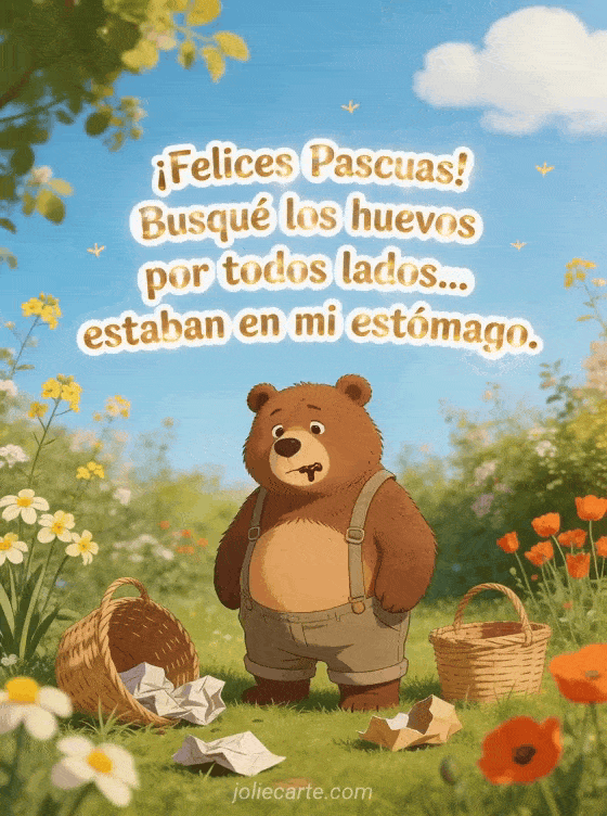 Celebre con esta hermosa tarjeta animada. Envie este mensaje de ¡Felices Pascuas! Busqué los huevos por todos lados... estaban en mi estómago. a sus seres queridos de forma gratuita. Descubra tambien Pascua humor o Pascua humor.
