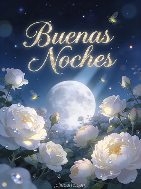 Comparte un tranquilo pensamiento de buenas noches con esta tarjeta con rosas blancas y peonías bajo la suave luz de la luna con gotas de rocío brillantes y luciérnagas flotando. Descubre también un mensaje de buenas noches tierno, un mensaje de buenas noches o una tarjeta buenas noches.