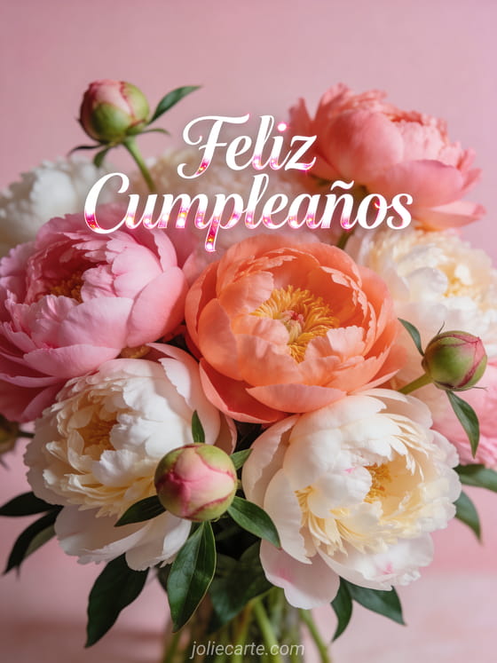 Celebra su cumpleaños con esta impresionante tarjeta que presenta un lujoso ramo de peonías en tonos rosa, coral y blanco crema con delicados capullos y follaje verde sobre un fondo rosa pálido. Descubre también una feliz cumpleaños ramo mujer o una cumpleaños mujer flores.