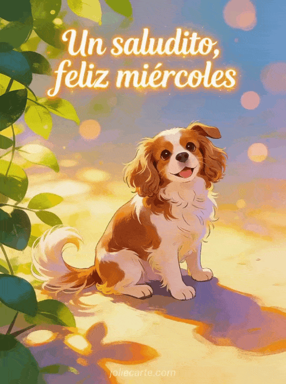 Envía un saludito cálido de feliz miércoles con letras divertidas, un perro Cavalier King Charles junto a hojas iluminadas por el sol, círculos de bokeh suaves y un ambiente colorido y alegre. También pueden ver estas feliz miércoles imágenes animadas, este feliz miércoles bajo la lluvia gif o este feliz miércoles con viento.