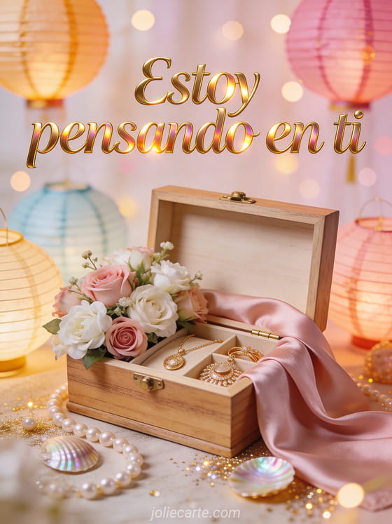 Comparte esta preciosa imagen gratis pienso en ti con una caja de madera con joyas y rosas frescas. Descubre también una tarjeta pienso en ti con una rosa o pienso en ti joya.