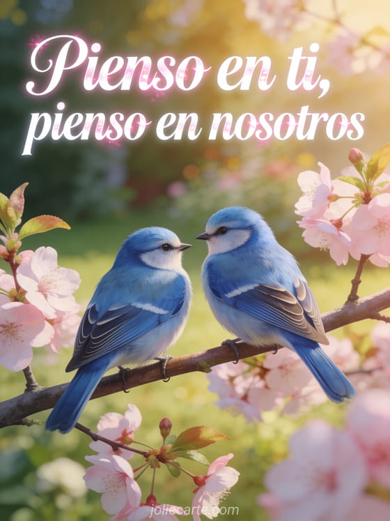 Envía esta tierna tarjeta con las palabras Pienso en ti, pienso en nosotros escritas en delicadas letras blancas con reflejos rosas, con dos herrerillos posados juntos en una rama de cerezo en flor mirándose con ternura. Descubre también una foto te amo pienso en ti o una imágenes pienso en ti besos.