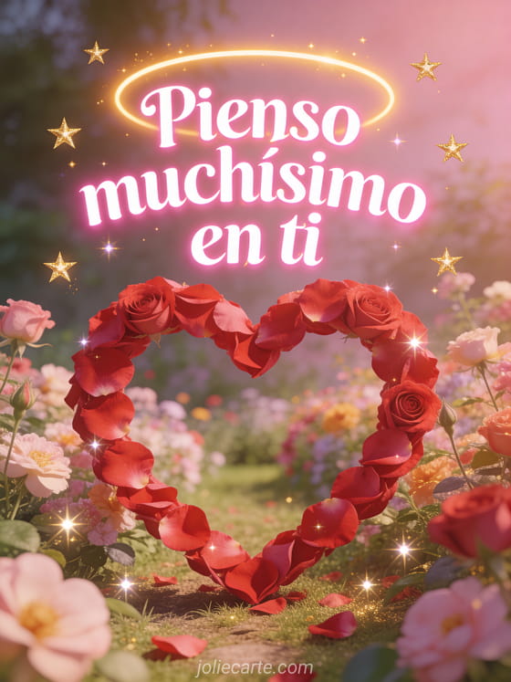 Comparte esta preciosa tarjeta pienso muchísimo en ti amiga con un corazón de pétalos de rosas en un jardín florido. Descubre también una tarjeta animada pienso en ti o cada día pienso en ti.