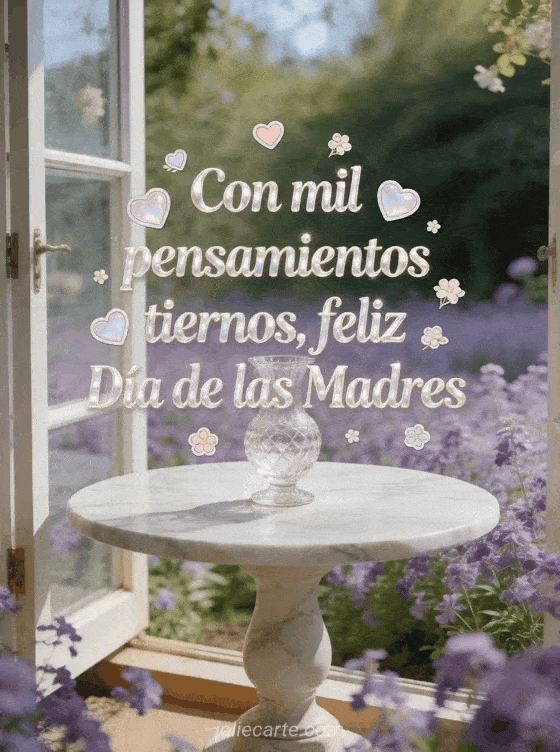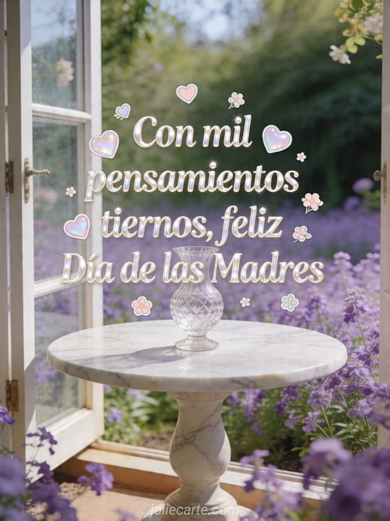 Comparte un poema corto para el Día de las Madres en una tarjeta realista y elegante con corazones pastel, flores pequeñas, violetas, un jarrón de cristal, mesa de mármol y ventana abierta al jardín. Descubre también imágenes gratis del Día de la Madre, feliz domingo feliz Día de la Madre o tarjetas virtuales gratuitas del Día de las Madres.