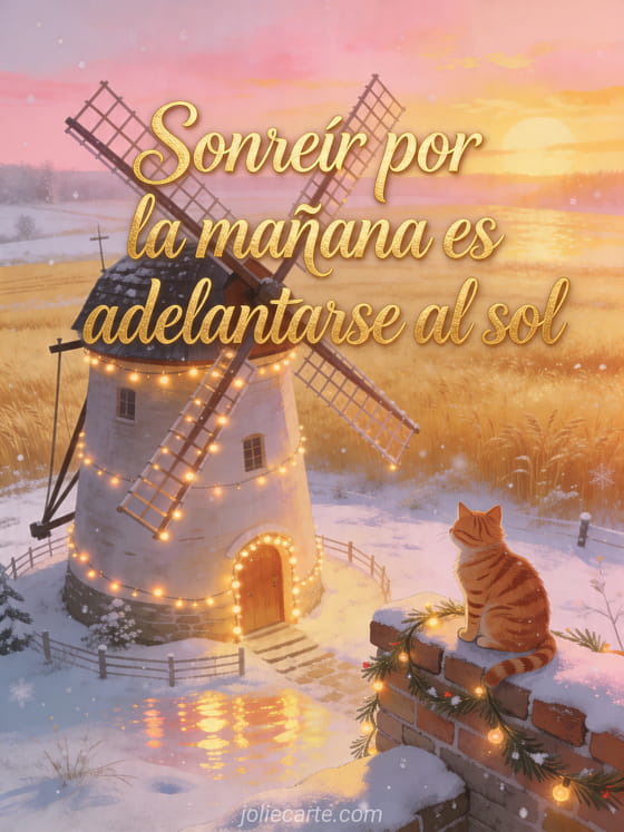 Envía un mensaje poético de mañana con un molino pintoresco, campos nevados y un gato naranja iluminado por la suave salida del sol. Descubre también amistad buenos días mensaje de la mañana, emilia-romagna tarjeta y hola matinal sms.