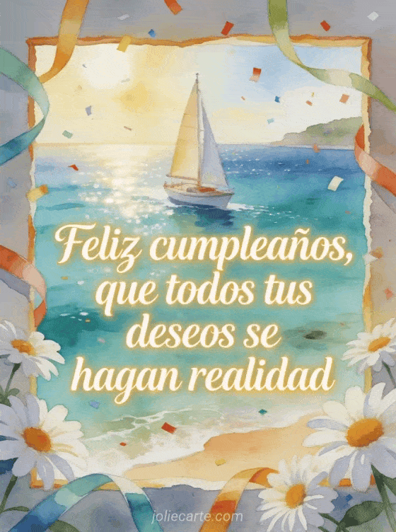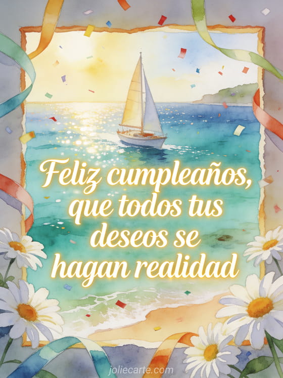 Envía un saludo de cumpleaños poético con un velero en acuarela que cruza una bahía turquesa brillante. Margaritas, cintas festivas y confeti enmarcan el deseo de que todos sus sueños se hagan realidad. Descubran también un poema de cumpleaños para mi hijo, un feliz cumpleaños mi hijo adulto o una tarjeta cumpleaños hijo adulto gratis.