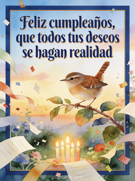 Envía un deseo de cumpleaños poético con un chochín sobre una rama, velas encendidas y un jardín en acuarela al amanecer. Cintas y confeti dan brillo a este mensaje especial. Descubran también una feliz cumpleaños mi hijo adulto, una tarjeta cumpleaños hijo adulto gratis o un poema de una madre a su hijo para su cumpleaños.