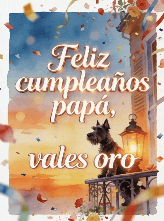 Envía un poema para su papá por su cumpleaños con letras marfil luminosas, un terrier escocés junto a una linterna brillante en un balcón festivo, pétalos, serpentinas y confeti sobre el borde. Descubre también un poema de cumpleaños para papá gratis, un feliz cumpleaños papá te quiero gif o una feliz cumpleaños papá tarjeta de cumpleaños.