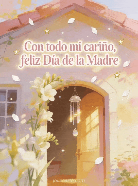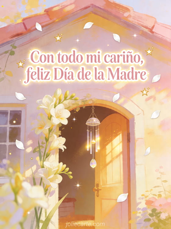 Compartan una tarjeta acogedora del Día de la Madre con una puerta de casa de campo, fresias frescas, un carillón delicado, pétalos blancos y estrellitas doradas. Descubran también Feliz Día de las Madres mamá fallecida, feliz Día de la Madre y feliz domingo o una cita para el Día de las Madres.