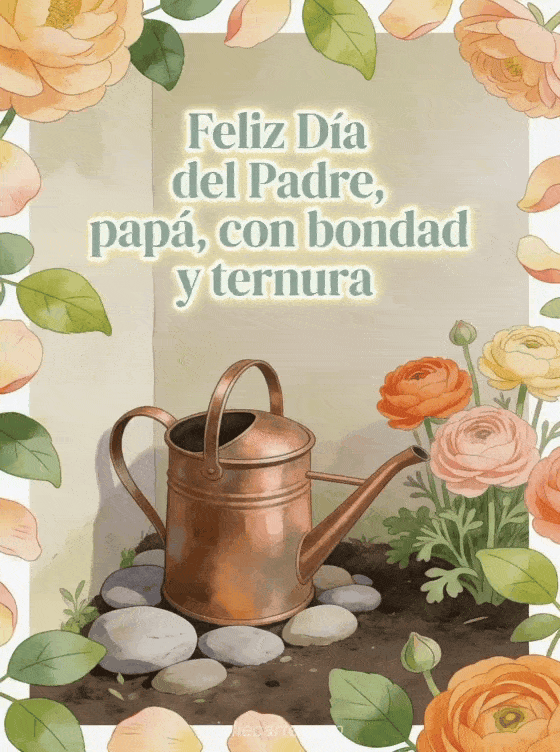 Envíen una poesía tierna de feliz Día del Padre papá con un rincón de jardín ilustrado, una regadera de cobre, piedras lisas, flores de ranúnculo en capas y hojas frescas en una paleta tranquila y alegre. Vean también dibujo feliz día del padre papá, una tarjeta Día del Padre papá o una tarjeta gratis del Día del Padre.