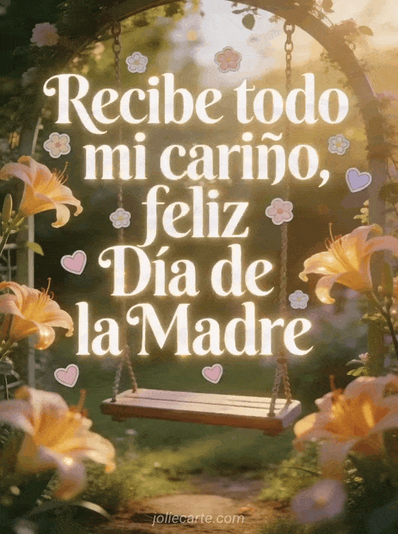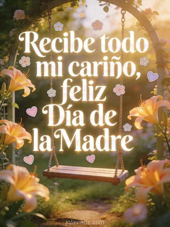 Comparte un saludo sereno con un columpio de jardín enmarcado por lirios de día luminosos, pequeñas flores y corazones pastel bajo la luz cálida de la tarde. También pueden enviar feliz Día de la Madre mi nuera, feliz Día de la Madre o imágenes del Día de la Madre.