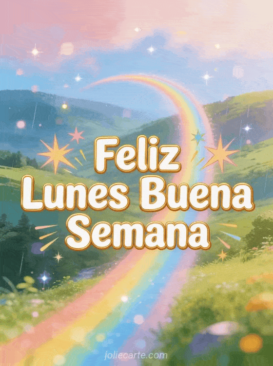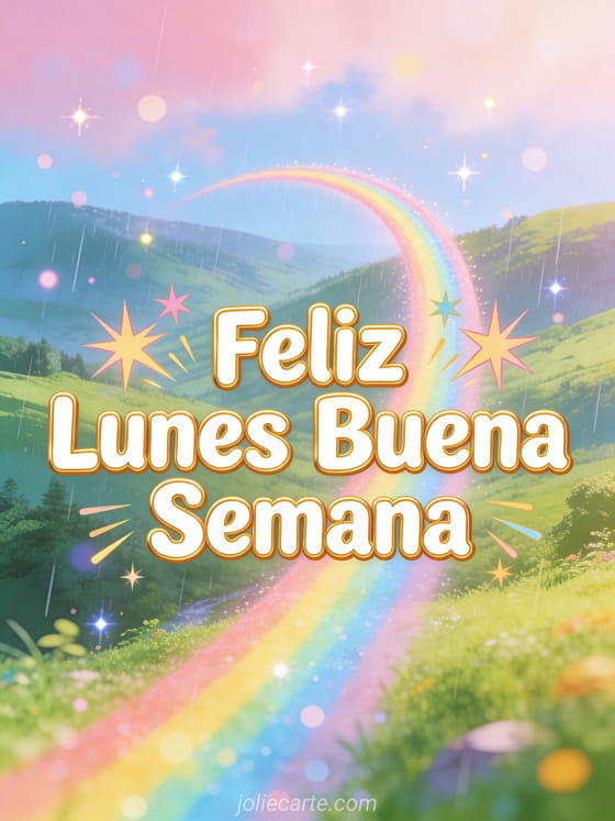 Empieza la semana con optimismo enviando esta hermosa tarjeta de feliz lunes. Un vibrante arcoíris después de la lluvia se extiende sobre un valle verde, lleno de energía positiva. Descubre también una tarjeta divertida de motivación del lunes o una tarjeta gif de feliz lunes.
