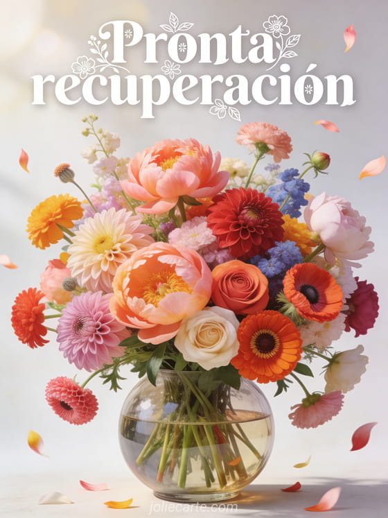 Envíen esta tarjeta de pronta recuperación para regalar ánimo con un ramo exuberante y luminoso. También pueden ver desear pronta recuperación a alguien, texto pronta recuperación y mensajes de pronta recuperación.