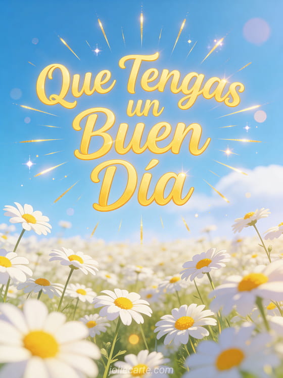 Comparte una alegre tarjeta de que tengas un buen día de lunes con un campo de margaritas bajo un cielo azul brillante. Envía un poco de sol de lunes para alegrar el día de alguien. Descubre también una tarjeta feliz lunes gato o una tarjeta imagen feliz lunes humor.