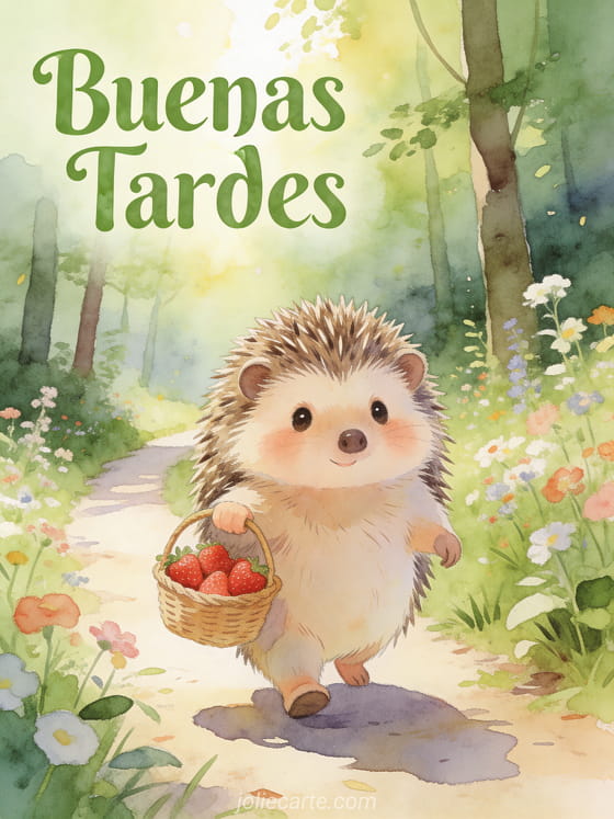 Alegra la tarde de alguien con esta adorable tarjeta que presenta un lindo erizo cargando una canasta de fresas en un sendero soleado del bosque con flores silvestres, pintado en suave estilo acuarela. Descubre también una buenas tardes o una buenas tardes humor.