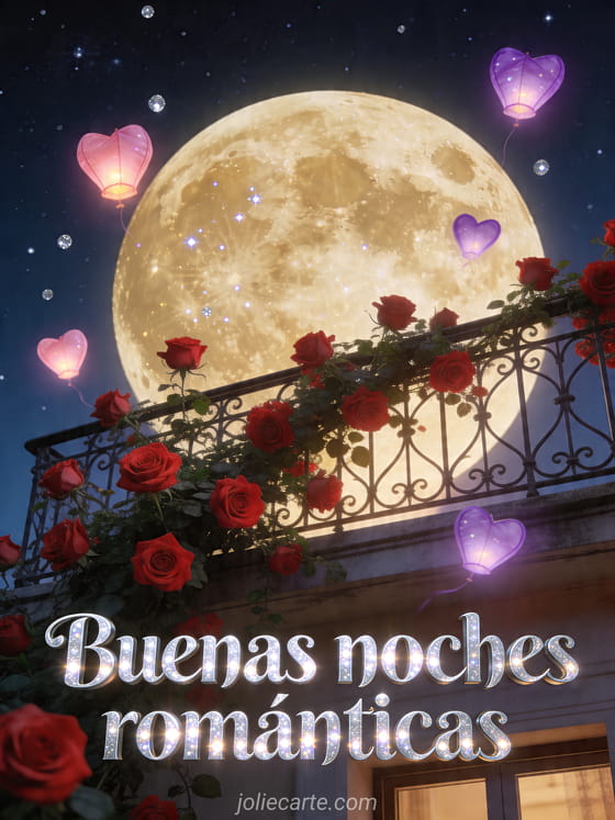 Deseen una noche mágica con esta tarjeta gratis de buenas noches románticas con rosas, luz de luna y corazones brillantes sobre un balcón. Descubran también besos de pareja en el agua, besos de amor corazón corazón gif o video besos de amor.